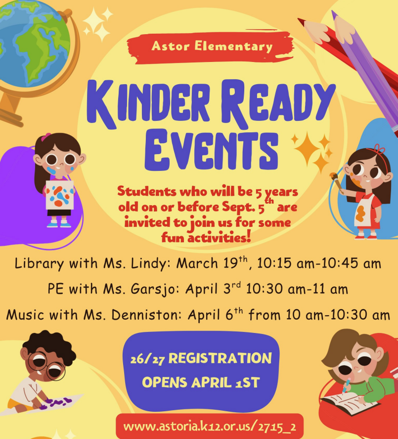 Kinder Ready Events @ Astor ElementaryStudents who will be 5 years old on or before Sept. 1st are invited to join us for some fun activities!Library with Ms. Lindy: March 19th 10:15 am - 10:45 amPE...